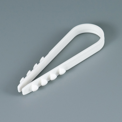 Дюбель-хомут — это пластиковая скоба с зубчиками. Зубчики упираются в материал поверхности установки, когда дюбель-хомут вставляется в отверстие. Это упрощает работу по сравнению с использованием комплекта из хомута, дюбеля и шурупа.